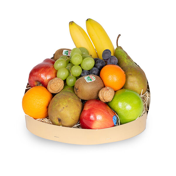 Golden Basic: mandje met vers fruit en noten. Een toegankelijke, gezonde verrassing voor elk moment. Simpel en altijd goed.